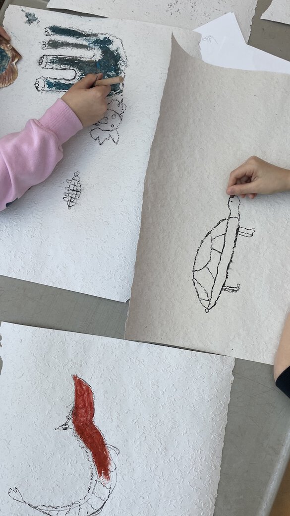 Ein besonderer Höhepunkt war die Gestaltung eigener Krafttiere auf Tapete (der Höhlenwand des 21. Jahrhunderts) mit selbstgebauten Pinseln aus Pferdehaaren und Pigmenten. Dabei konnten die Erkenntnisse aus der Führung durch die Ausstellungsbereiche praktisch und kreativ umgesetzt werden.