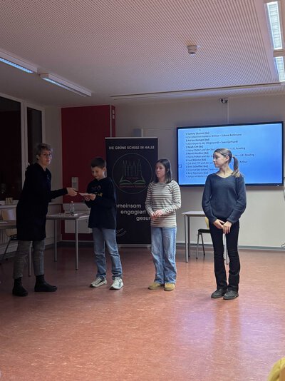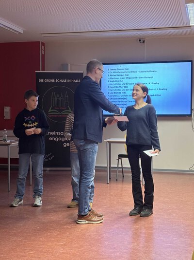 Die Jury verkündete nach ihrer Beratung schließlich die Platzierungen und überreichte zusammen mit Frau Dobrovsky die Preise, die auch 2025 vom Schulförderverein gesponsort wurden.