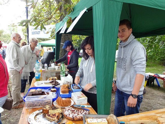 Das Wetter meinte es gut mit den Organisatoren und Gästen. Nach den erledigten Vorbereitungsaufgaben, die Kuchen waren gebacken, der Verkaufsstand errichtet, Tische und Bänke standen bereit und die Kaffeemaschinen in Position gebracht, konnte pünktlich um 11.00 Uhr mit dem Verkauf für einen „guten Zweck“ begonnen werden. In diesem Jahr sollten die Einnahmen für die vielfältigen Schulprojekten, angeführt vom Schuljahrbuch verwendet werden.