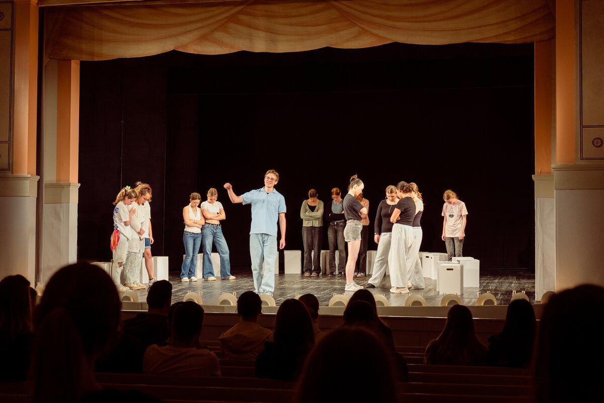Der 28.05.25 sollte der krönende Abschluss unseres Aufführungsmarathons werden, denn unsere AG war zu den diesjährigen Landesschülertheatertagen Sachsen-Anhalts eingeladen worden. Nach einer kurzen und intensiven Probe am Vortag im Goethe-Theater von Bad Lauchstädt, wo die große Bühne erkundet und Auf- und Abgänge neu einstudiert wurden, sowie technische Kooperationen mit dem Bühnenmeister zu treffen waren, galt es die historischen Bühnenbretter Goethes schauspielerisch zu beleben. Dies gelang der Schauspielgruppe vor dem unbekannten Publikum überzeugend, wie der starke Beifall und vereinzelte Bravorufe vermuten lassen. Wir danken herzlich dem Schulförderverein für die finanzielle Unterstützung.