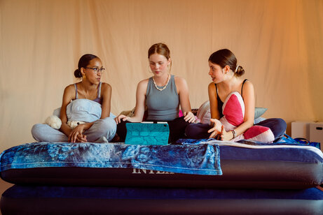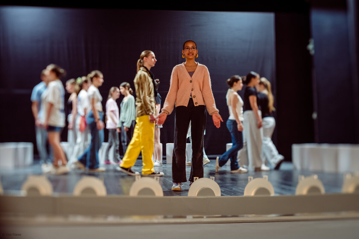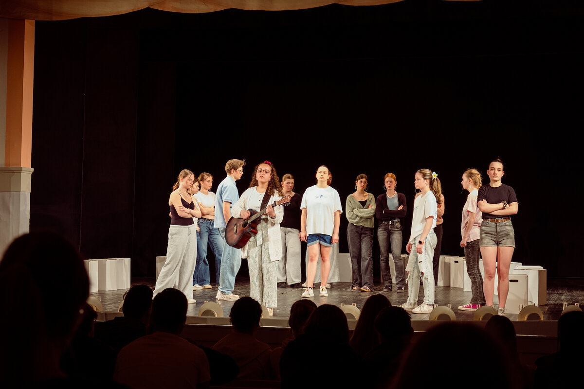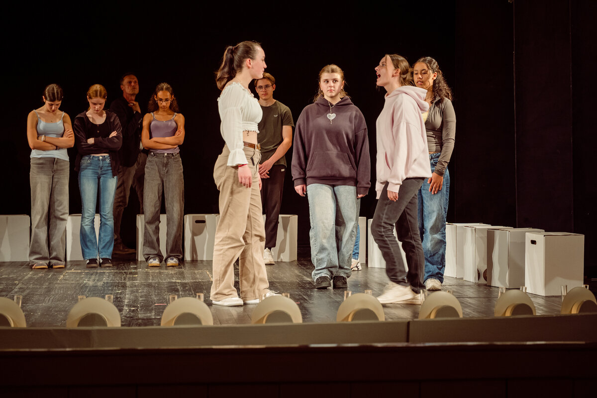 Diese Konflikte vermieden wir glücklicherweise bei unseren Proben, weil uns im gemeinsamen Spielen die Bedingungen des Miteinander klarer wurden. Gleichzeitig galt es, die sich der Kooperation widersetzenden Momente lebensnah darzustellen. So diskutierten wir am Anfang gemeinsam Schwierigkeiten, die Heranwachsende in ihrer Interaktion hemmen. Zielstrebig erschufen daraufhin die Schauspielerinnen und Schauspieler ihre charakteristischen Rollen und erarbeiteten sich Konstellationen von Beziehungen, die in ihrem situativen Zusammenwirken eine unaufhaltsame Dynamik entfalteten. Dabei gelang es den Schülerinnen und Schülern in unserem Probewochenende immer besser, sich in ihren darzustellenden Charakter hineinzuversetzen und gleichzeitig die Figur zu schärfen. Dieses Verständnis half den Schauspielerinnen und Schauspielern, sowohl Figuren auf der Bühne authentisch zu verkörpern als auch in der Gruppe zu interagieren. Ein weiteres Qualitätsmerkmal der gemeinsamen Arbeit zeigte sich, als der krankheitsbedingte Ausfall einer Schauspielerin kompensiert werden musste. Als Gruppe unterstützten sie sich gegenseitig bei der Umbesetzung und allen damit einhergehenden Veränderungen.
