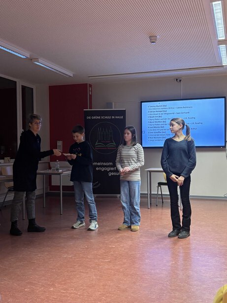 Als Anerkennung für ihre tolle Leseleistung erhielten sie Büchergutscheine, alle anderen Teilnehmer bekamen ein Lesezeichen. Die Bestplatzierte nimmt nun am Lesewettbewerb der Stadt teil. Gegen 12:00 Uhr war dann der Vorlesewettbewerb zu Ende.
