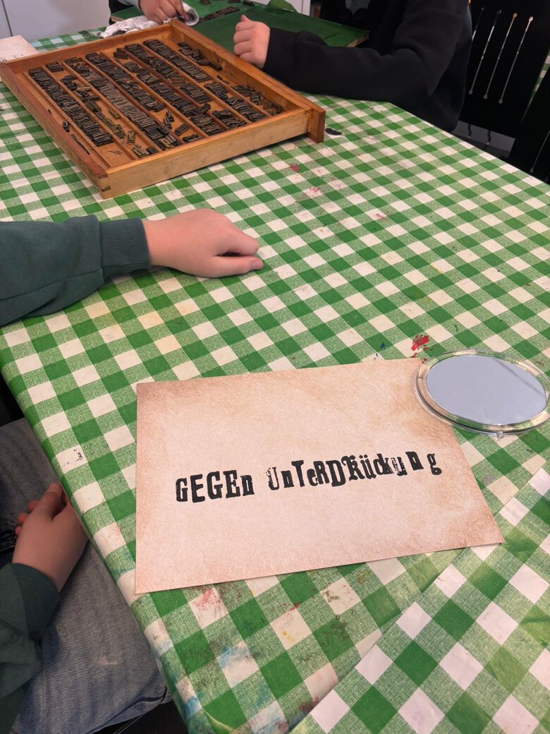 Durch den Buchdruck von Johannes Gutenberg wurden die Menschen jedoch gebildeter und die Reformation und der Kampf für Gerechtigkeit setzte sich in Mitteleuropa durch. Mit beweglichen Lettern konnten wir dann noch unsere eigenen Flugblätter setzen und drucken.