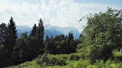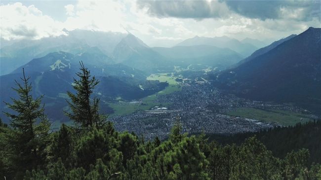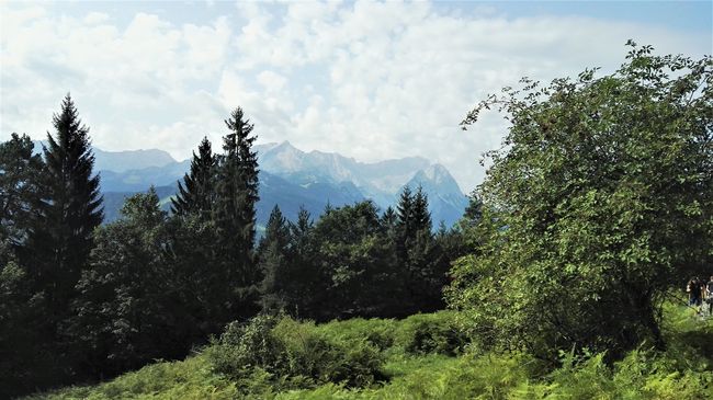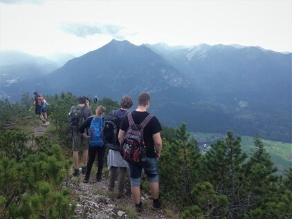 Nach einer ersten Pause setzte die Gruppe ihre Wanderung fort. Der darauffolgende Aufstieg zehrte an den Kräften, treppenartige Wurzelverflechtungen und Holzkeile wechselten sich mit steinigen Passagen bis zum Gipfel des Berges ab. Zwischenzeitlich pausierte die Gemeinschaft etwas länger auf etwa halber Höhe auf einer kleinen Alm mit Aussicht auf den Alpspitz (ca. 2600m) und das finale Ziel: die Zugspitze. Als die letzten Meter des Wanks absolviert worden waren, wurde die Gruppe mit dem Blick auf eine Almhütte belohnt, erfreulicherweise waren sogar Sonnenliegen vorhanden, in denen es sich die erschöpften und doch glücklichen Akteure sogleich gemütlich machten. Vom Wankgipfel aus bot sich ein wunderbarer Blick auf die Gemeinde im Tal. Nach diesen Momenten der Ruhe und des Glücks eroberten die Wanderbegeisterten noch das Gipfelkreuz für ein paar Fotos und traten dann schließlich den Heimweg an. Der Abstieg erwies sich als langwieriger und steiler Fußmarsch, das Wetter begann sich zu verschlechtern. Nieselregen und Wind trübten bei so manchem ein wenig die Euphorie, v.a. bei jenen, die aufgrund der glatten Steine eine Bruchlandung hinlegten. Die Gruppe erreichte die Talstation leider erst fünf Minuten nach Abfahrt des letzten Busses. Etwas genervt wurde der Weg zur JH zu Fuß angetreten, aber der Hunger beflügelte die Gruppe und forcierte das Tempo.