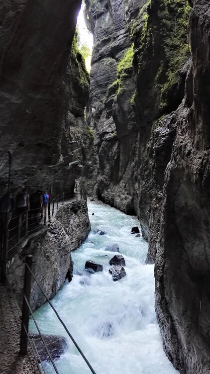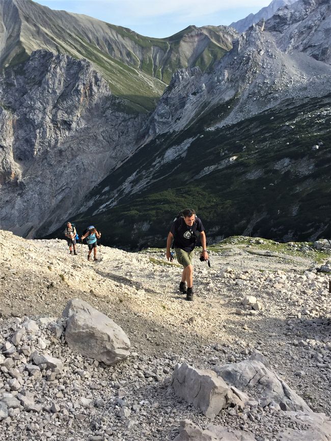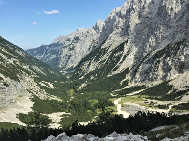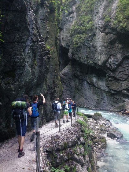 Mittwoch, der 29.08., war „DER GROSSE TAG“, die erste Etappe der Zugspitze sollte beginnen. Nur das Nötigste durfte im Rucksack mitgenommen werden, was nicht allen leichtfiel. Nach einer morgendlichen Stärkung führte der erste Weg durch die Partnachklamm, ein Naturdenkmal besonderer Art. Die Schlucht ist durchzogen von Wasserfällen und Stromschnellen, ein kleiner Pfad führt die Felswände entlang. Überwältigt von dem Naturspektakel zog die Gruppe weiter, Ziel war es, durch das Reintal auf die Zugspitze zu wandern. Tagesetappe sollte dabei die Knorrhütte auf etwa 2100m sein. iiiiiiiiiiiiiiiiiiiiiiiiiiiiiiiiiiiiiiiiiiiiiiiiiiiiiiiiiiiiiiiiiiiiiiiiiiiiiiiiiiiiiiiiiiiiiiiiiiio Allmählich begannen die Anstiege steiler zu werden und die Gruppe verspürte die Anstrengung der langgestreckten und doch wunderschönen Wege. Die Partnach begleitete uns, zu ihrer Quelle sollten wir noch vorstoßen. Die Wanderung erstreckte sich entlang verschiedenster Vegetationszonen, der ansteigenden Höhe folgend. Typische Pflanzenarten konnten entdeckt und benannt werden, bevor der Weg in fast vegetationslose Steinwüste überging. (Dank an dieser Stelle an alle informativen Schülervorträge unter Anleitung der Lehrer.) Während die Vegetation zu schwinden begann, mussten auf den letzten Kilometern Gesteinsformationen überwunden werden, kraftraubende Sprünge über Geröllbrocken und Steine forderten die volle Konzentration und Geduld. Der Weg schien kein Ende nehmen zu wollen. Nach gut zwei Stunden konnte endlich das Tagesziel, die Knorrhütte, über die Berghänge hinweg erblickt werden. Die letzten herannahenden Wanderer wurden von den Ersten bejubelt..