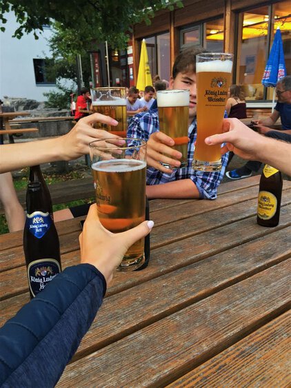 Die Anreise per Zug am Sonntag verlief problemlos. Spätestens ab München ergriff alle die Vorfreude auf die wunderschöne Bergwelt. In der „Kinderecke“ der Regionalbahn fühlten sich auch große Kinder sehr wohl. Am Zielort angekommen, begleitet von leichtem Regen, wurden als erstes die Zimmer der modernen und sauberen Jugendherberge bezogen. Das kleine, aber feine Ambiente der Räume ähnelte typischen Klassenfahrtunterkünften und sorgte somit für ein wenig Nostalgie in Anbetracht des baldigen Schulabschluss‘. Zu Abend wurde alsbald gegessen. Die Küche versorgte die mehr oder weniger Hungrigen mit qualitativ hochwertigem und wohlschmeckendem Essen (Shoutout an die Küche und besonders den Koch: die ganze Woche lang sehr leckere und variationsreiche Mahlzeiten, welche immer die Kraft in die müden Glieder zurück brachten!) Zu einem abendlichen original bayerischen Weißbier wurde schließlich auf die bevorstehenden Abenteuer angestoßen, die Wanderer waren bereit.