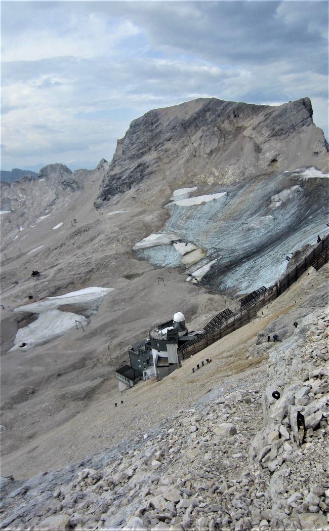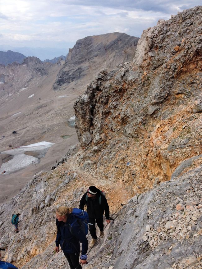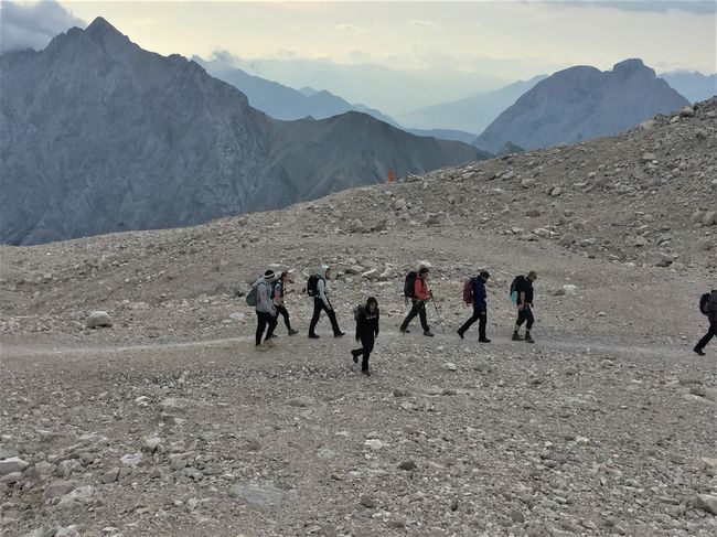 Am nächsten Morgen von der frischen Bergluft geweckt (und einem Wecker) ging es nach einem trockenen Frühstück weiter. Knapp 900 Höhenmeter lagen noch vor der Wandergruppe, steile Anstiege und Schutt prägten die Strecke, der Pfad war schmal, doch meist gut erkennbar. Nach etwa einer Stunde des verhältnismäßig kuzen Aufstiegs gelangte die Gemeinschaft an den letzten Stopppunkt der Wanderung: Vor ihnen lag ein ca. 200m hohes steiles Geröllfeld, welches erst bestiegen werden musste, bevor entlang des Gipfelsteigs im eisigen Wind die Zugspitze erklommen werden konnte. Nach der letzten gemeinsamen Pause erfolgte die finale Bergbesteigung. Gutes griffiges Schuhwerk war besonders zu dem Zeitpunkt wichtig, denn die vom Eis rundgeschliffenen Steine boten ständige Abrutschgefahr. Mancher trat Geröll los, welches Nachfolgende gefährden konnte. Ein Sicherheitsabstand war deshalb zwingend nötig und ständige Vorsicht geboten. Am Ende des Geröllfeldes angekommen, setzte sich der Weg an der Felswand fort. Zum Festhalten in den Fels eingelassene Stahlseile dienten dem Abstützen und Hochziehen, während Felsklippen und –fortsätze überwunden werden mussten. Dies dauerte noch einmal etliche Minuten bis eine (unnötig hohe) Treppe zum Gipfelhaus hinaufführte.