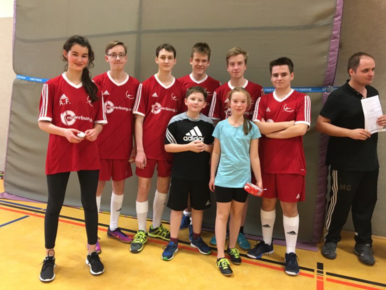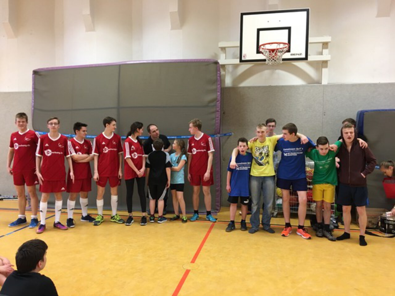 Für uns liefen in nagelneuen Trikots, gesponsert vom Schulförderverein, Yannik Wirtz, Anton Ebensing, Tobias Steinicke, Jonas Bauermann und Luis Wellhöfer auf. Unsere Reihe wurde komplettiert durch drei Jugendspieler des USV, Anna, Ben-Ole und Jette. Nur die Mannschaft des Georg-Cantor-Gymnasiums trat nicht an, da die beiden wichtigsten Stammspieler zum Trainingslager der Landesauswahl waren. Auch Hannes Wiedemann aus unserer Mannschaft befand sich dort.