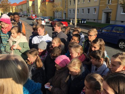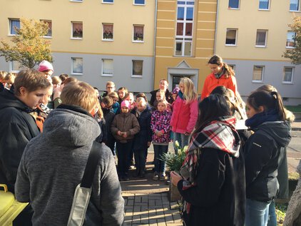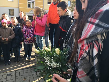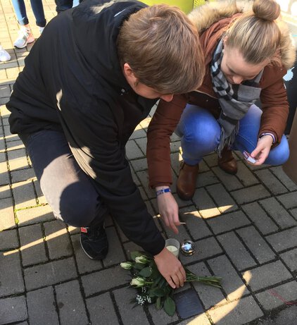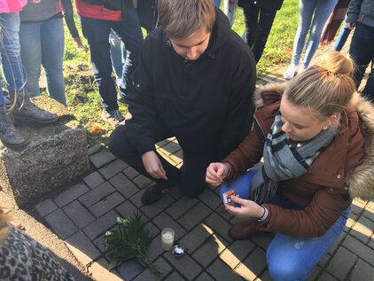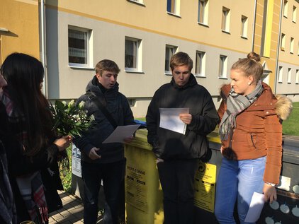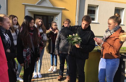 Auch in diesem Jahr gingen wieder zwei Schülergruppen gemeinsam mit einigen LehrerInnen in den Falkenweg 7 und in die Benkendorfer Str. 72, um an den Stolpersteinen der jüdischen Frauen Martha Dittmar und Henriette Sauer zu gedenken. Zuerst informierten SchülerInnen aus der Klasse 10 c über die Schreckensherrschaft der Nationalsozialisten in Deutschland, danach sprachen sie über das Schicksal der beiden Frauen und trugen ihnen zu Ehren ein kleines Gedicht vor. Dann legten sie drei weiße Rosen nieder und entzündeten ein Lebenslicht.