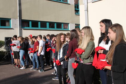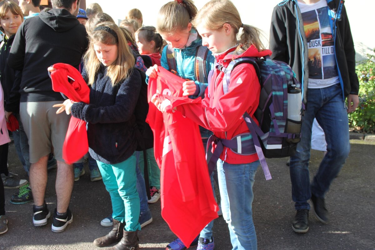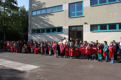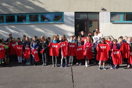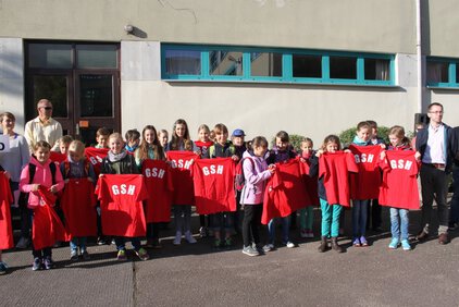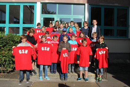 Punkt 8:00 Uhr begrüßte Frau Kober die neuen Fünftklässler und deren Eltern. Die neuen Klassenleiter-Teams warteten bereits. Als Begrüßungsgeschenk gab es für jeden Neuling ein rotes T-Shirt mit dem Schullogo und dem Schul-Kürzel "G S H " (Gymnasium Südstadt Halle), das von den Zwölftklässlern überreicht wurde.