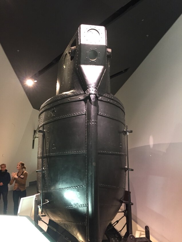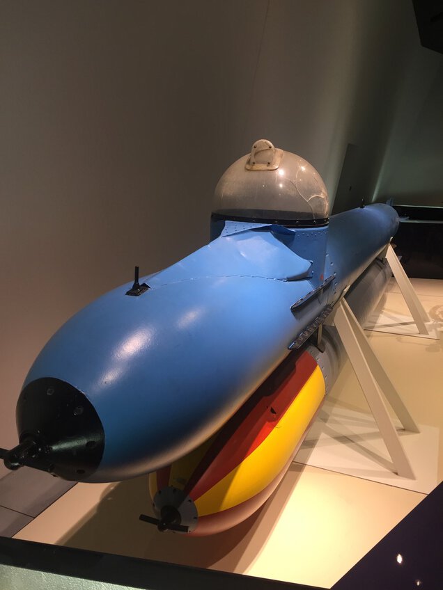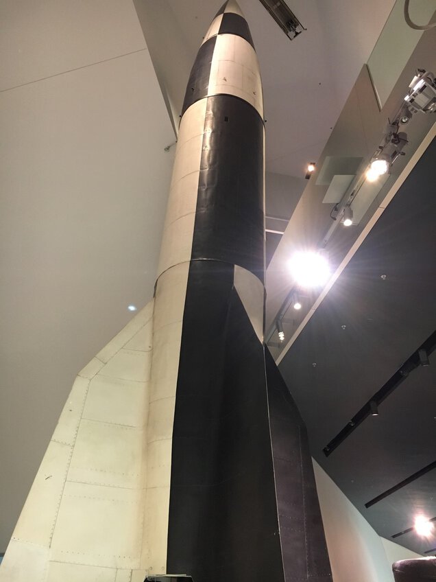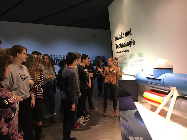 Auf unseren Rundgängen erklärten uns die Museumspädagogen auch viele technische Details, die uns beeindruckten, so z.B. die Nutzung eines Kamikaze-Torpedos, der sich unter einem Einmann-U-Boot befand. Dieses Ausstellungsstück (siehe Foto) ist übrigens das älteste erhaltene Tauchboot der Welt. Sehr interessant waren auch die Informationen über die Raketentechnik der Nazis bis hin zur zivilen Nutzung dieser Technologie für die Raumfahrt. Die so genannte „Wunderwaffe“ der Nazis, die V 2 (siehe Foto), sahen wir in ihrer vollen Größe. Eigentlich erschien sie uns recht klein, doch ist sie schließlich über 70 Jahre alt und wohl mit heutigen Raketen nicht vergleichbar ...