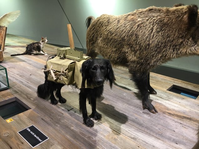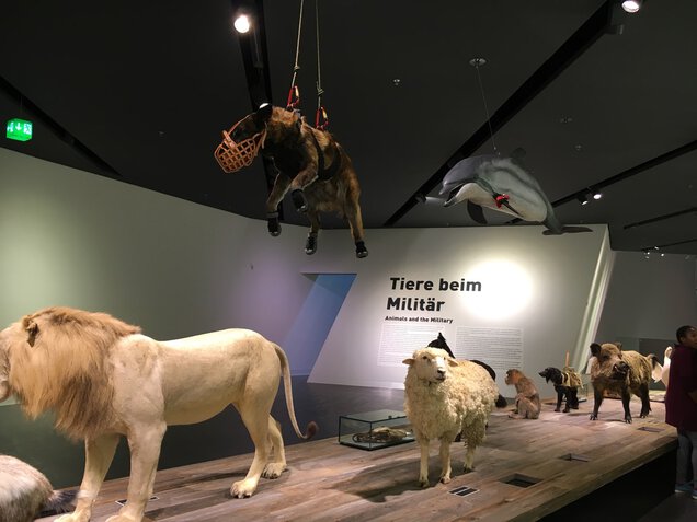 Exkursion der neunten Klassen: Auf einem Laufsteg präsentiert das Militärhistorische Museum der Bundeswehr in Dresden Tierpräparate vom Maultier einer Gebirgsjägereinheit der Bundeswehr bis hin zu Schaf, Pferd und Hund.
