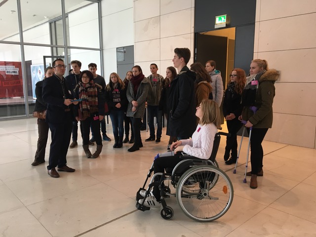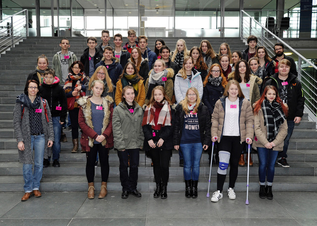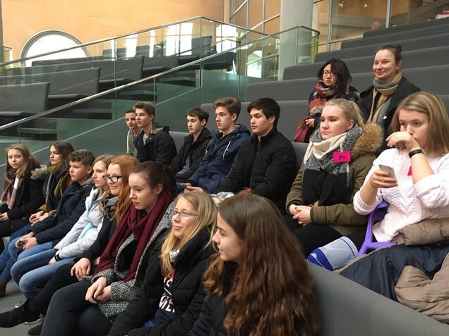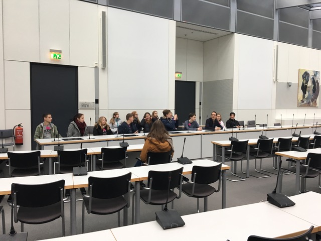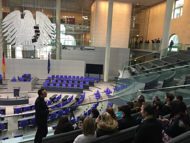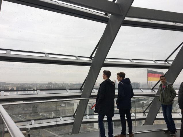 Am Montag, dem 20. Februar 2017 startete in den frühen Morgenstunden die Exkursion der zwei Sozialkundekurse der Jahrgangsstufe 10 zum Deutschen Bundestag. In Berlin angekommen bekamen wir eine informative Führung durch das Reichstagsgebäude, bei der wir unter anderem den Plenarsaal und den Fraktionssaal der „Linken“ besichtigen durften. Außerdem erhielten wir die Möglichkeit, in die berühmte Glaskuppel des Gebäudes zu gehen und eine Rundumsicht über Berlin zu erlangen.