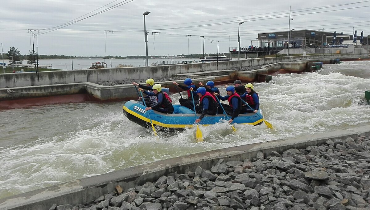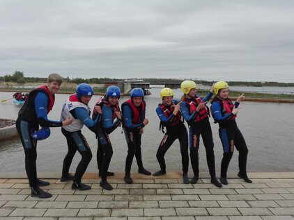 Am 15.05.2019 reisten sieben Schüler/innen aus der Jahrgangsstufe 9 zum MITGAS Schüler-Rafting Turnier nach Markkleeberg. In der hitzigen Qualifikationsphase bewiesen die Nachwuchs-Kanuten Nervenstärke, Siegeswillen und die nötigen Körner im Bizeps, um sich gegen elf weitere Teams durchzusetzen. Dank der schnellsten Rundenzeit fährt unser Team des Gymnasiums Südstadt am 28.05.19 zum Finale. Dort lockt die „Goldene Ananas“ bei hoffentlich besseren Wetterbedingungen!