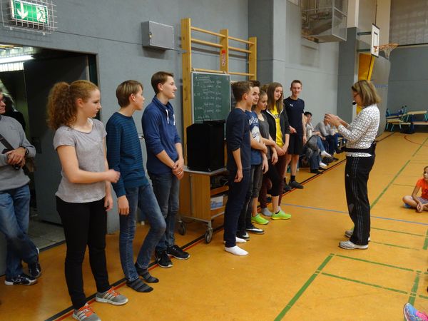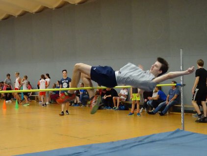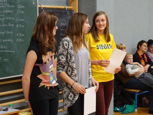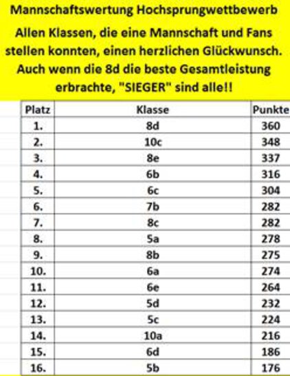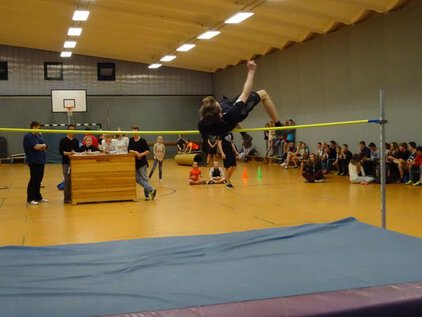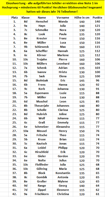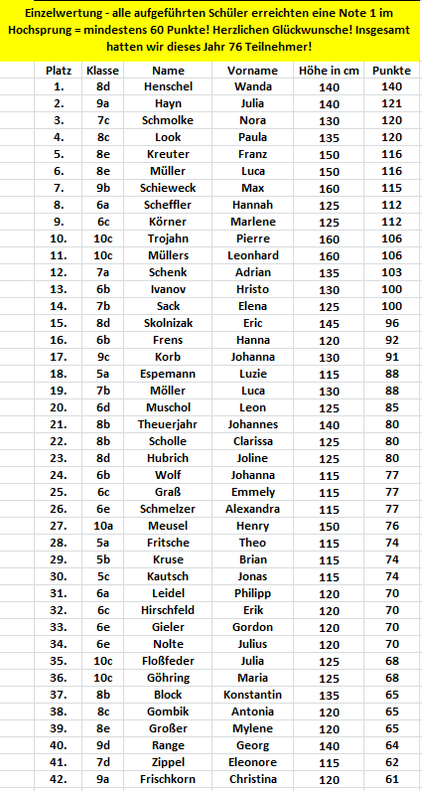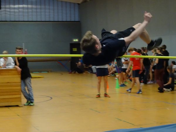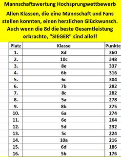 Die Turnhalle des Gymnasiums Südstadt war sehr gut gefüllt: 76 aktive Teilnehmer, Lehrer, Eltern und viele Schüler die ihre Mitschüler an den Seiten anfeuerten, trugen dazu bei, dass der diesjährige Hochsprungwettbewerb ein Riesen-Erfolg wurde. Insgesamt stellten 16 Klassen eine Mannschaft, die wie jedes Jahr aus 2 Jungen und 2 Mädchen bestehen. Dabei konnte die Klasse 8d mit Wanda Henschel nicht nur die Siegerin des Hochsprungwettbewerbs in der Einzelwertung stellen, sondern auch in der Mannschaftswertung den ersten Platz belegen. Mehr als die Hälfte aller teilnehmenden Schüler am Hochsprungwettkampf konnten mit jeweils über 60 Punkten ihre herausragende Qualität unter Beweis stellen.