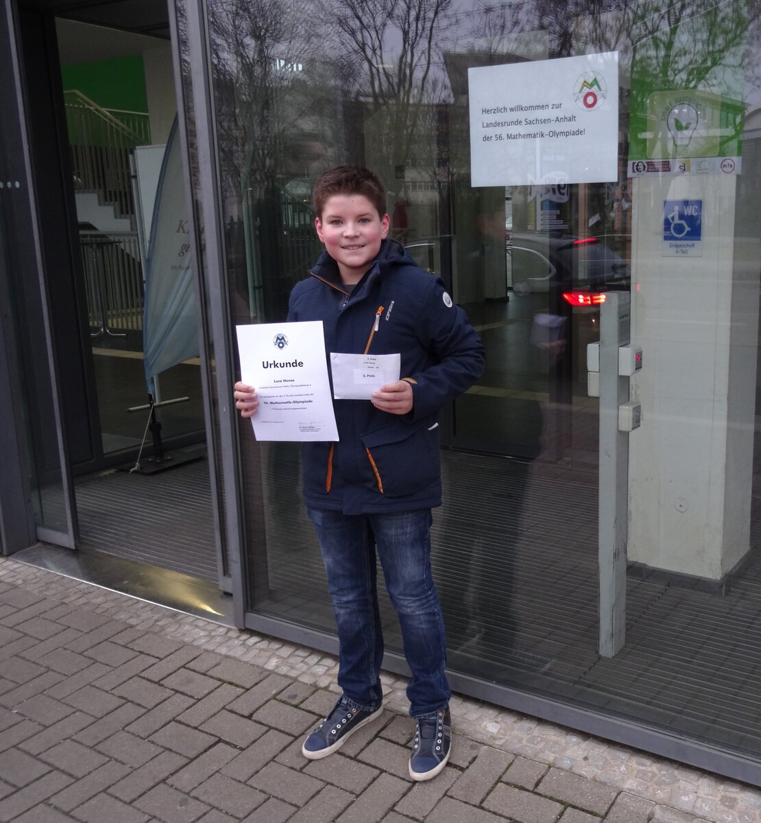 Luca Hense aus der Klasse 6a vertrat auch in diesem Jahr unsere Schule erfolgreich bei der 56. Mathematik - Olympiade 3. Stufe (Landesrunde) am 24. und 25.2.2017 in Magdeburg. Am Freitagnachmittag waren drei anspruchsvolle und knifflige Aufgaben in 270 Minuten zu bearbeiten. Das gleiche Pensum musste dann am Samstagvormittag noch einmal bewältigt werden. Am späten Samstagnachmittag erfolgte dann die feierliche Siegerehrung. Von 40 möglichen Punkten erreichte Luca sehr gute 32 Punkte. Dafür erhielt er einen 3. Preis.