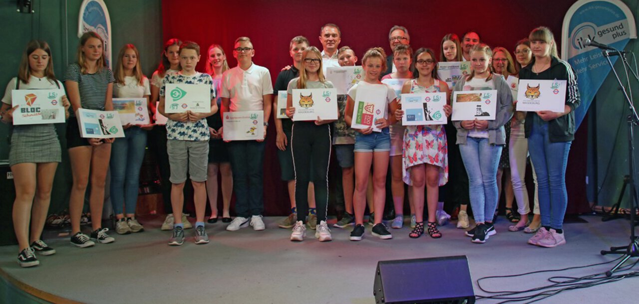 Am 14.06. machten sich 4 Schüler aus unserer Klasse – Emily, Johanna, Rosa und Veit – mit Herrn Langer zur Preisverleihung nach Magdeburg auf. Die Zugfahrt füllten wir mit Gummibärchen, Kartenspielen und interessanten und lustigen Gesprächen. Als wir dann ankamen, schauten wir uns unsere Landeshauptstadt an. Nach einem kurzen Spaziergang kamen wir zum Veranstaltungsort, der Jugendkunstschule Thiem 20, begaben uns mit anderen Klassen aus Sachsen-Anhalt in den Veranstaltungssaal und warteten gespannt auf die Auswertung. Nach einer kurzen Kultureinlage, weiteren Informationen über die schädlichen Auswirkungen des Rauchens und Reden von Vertretern einer Krankenkasse, des Deutschen Roten Kreuzes und unseres Bildungsministers ging die Preisübergabe los.