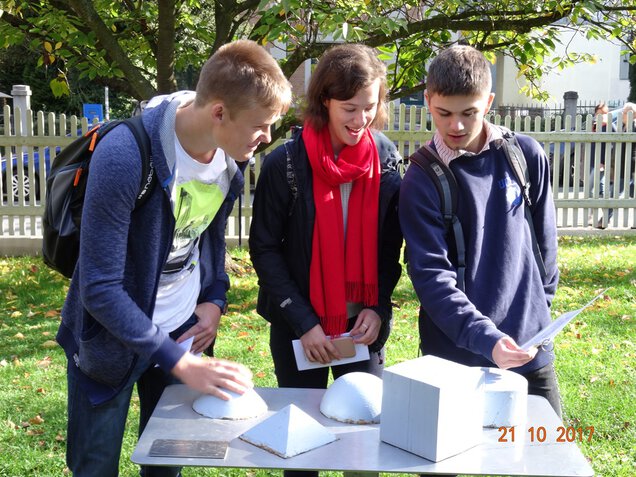 Ende Oktober fuhren drei physikinteressierte Schüler der 11. Klasse mit ihrem Physiklehrer nach Jena, um in der physikalisch-astronomischen Fakultät der Universität Jena an einer Vorlesung über astronomische Blicke auf die Welt zur Zeit der Reformation teilzunehmen. Der Dozent Prof. Karl-Heinz Lotze erklärte den ca. 150 Zuhörern die Gemeinsamkeiten und Unterschiede des heliozentrischen und geozentrischen Weltbildes. Diese Vorlesung war zum einen die Eröffnungsvorlesung 2017und die insgesamt 120. Vorlesung der öffentlichen Samstagsvorlesungen, die bereits seit 18 Jahren immer im Wintersemester stattfinden. Nach lehrreichen und interessanten 75 Minuten machten wir noch einen Abstecher zum Zeiss Planetarium und der dort befindlichen Station des Mathematikrundweges (siehe Bild 1). Hier galt es die Frage zu beantworten, in welchem Volumenverhältnis Zylinder, Halbkugel und Kegel stehen, wenn die Grundflächen und Höhen gleich sind.