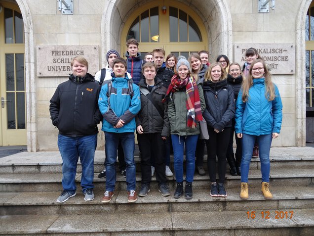 Am 16. Dezember 2017 besuchten 19 Schüler der 9. bis 11. Klasse eine weitere öffentliche Samstagsvorlesung in Jena (siehe Bild 2). Diesmal referierte Dr. - Ing. Volker Tympel vom Helmholtz - Institut Jena zum Thema "Physik und Smartphone". Er schaute mit ca. 200 Zuhörern in das Innenleben der Smartphones, wo man trägen Mini - Massen, Corioliskraft, Hall - Effekt, Drucksensoren, viel Funktechnik und anderem begegnet. All dies benutzte er und machte klassische Experimente der Physik mit dem Smartphone, so ließ er z.B. im Hörsaal ein Smartphone aus 10m Höhe frei fallen... Ein weiterer Höhepunkt war der anschließende Besuch im Zeiss Planetarium, dem dienstältesten Planetarium der Welt. In ca. 60 Minuten erfuhren wir die neuesten wissenschaftlichen Erkenntnisse in spektakulären Bildern zu den Planeten unseres Sonnensystems. Nach einem abschließenden Bummel über den Jenaer Weihnachtsmarkt erfolgte die Rückfahrt nach Halle.