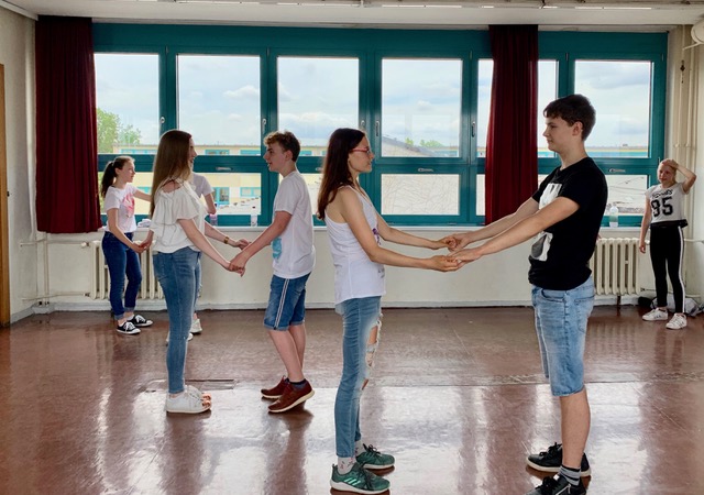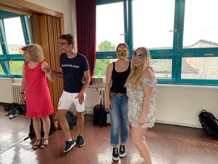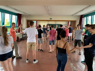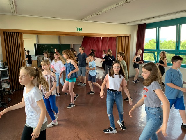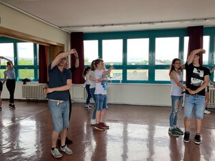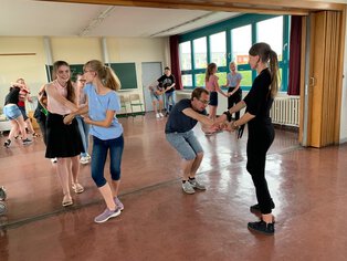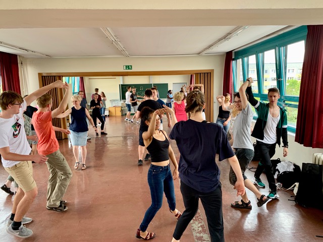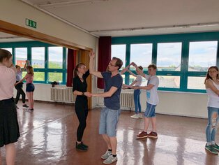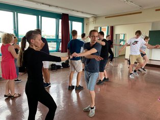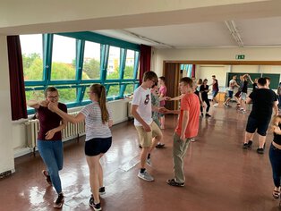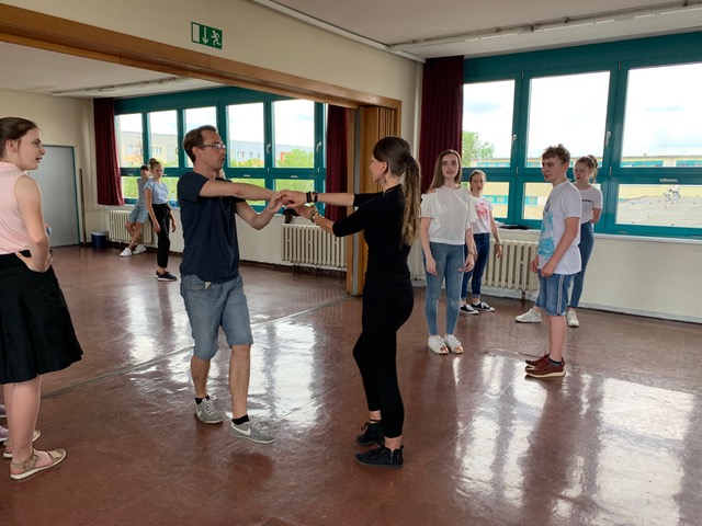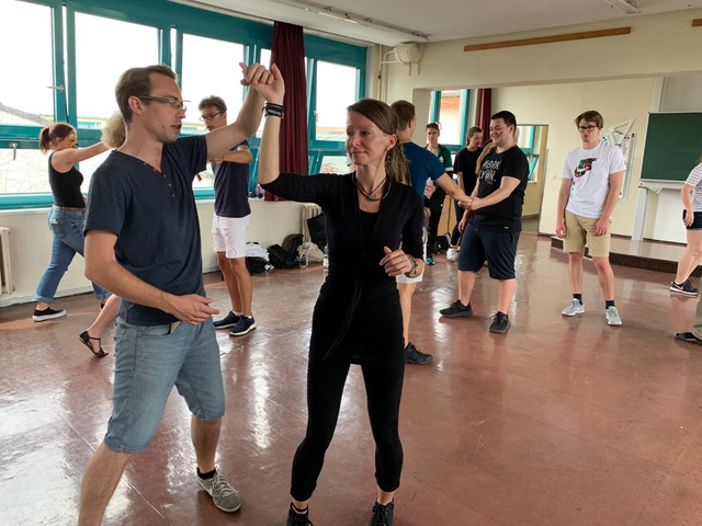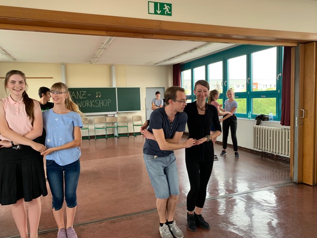 Daniel Decker und Roxana Reuß vom Tanzhaus a. d. Saale vermittelten den teilnehmenden Schülern verschiedener Klassenstufen erste Grundlagen des Disco-Fox. Doch man versuchte sich auch an einfachen Drehungen und Figuren wie dem „Körbchen“ und dem „Taucher“, wobei schnell Erfolge zu verzeichnen waren. So machte es sehr viel Freude, trotz der heißen Temperaturen gemeinsam das Tanzbein zu schwingen.