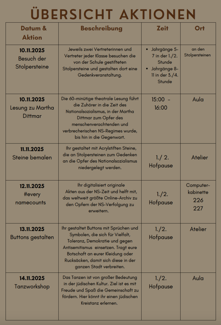 Im November 2025 findet am Gymnasium Südstadt eine Themenwoche statt, die unter dem Motto "Gemeinsam gegen Antisemitismus" an antisemitische Verbrechen der Vergangenheit erinnern, aber auch zu Toleranz und Engagement in der Gegenwart aufrufen möchte.