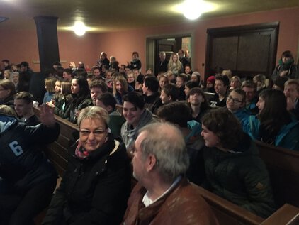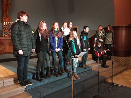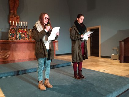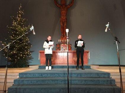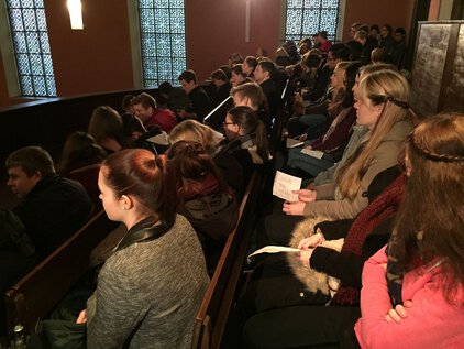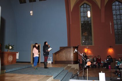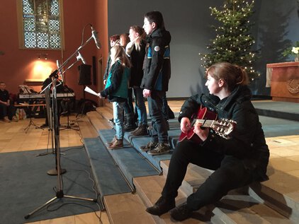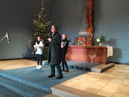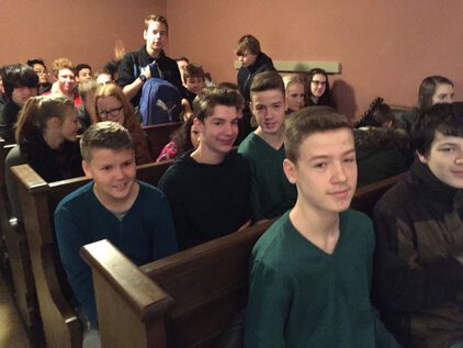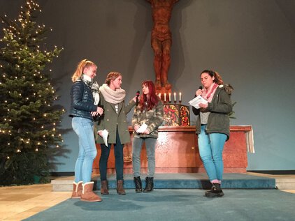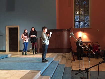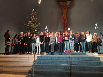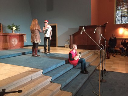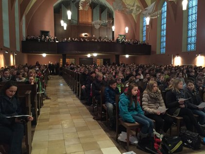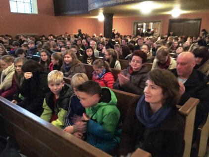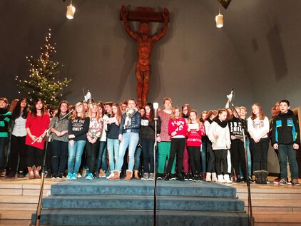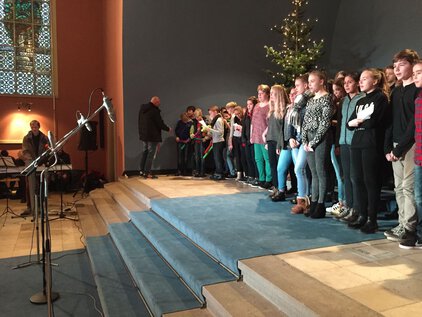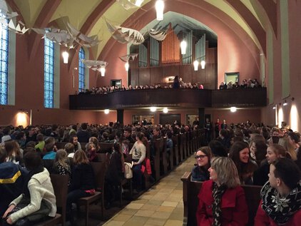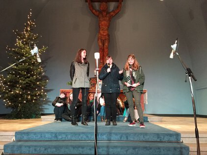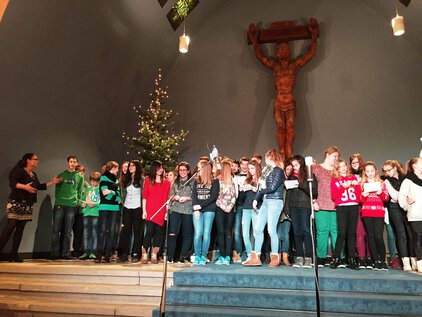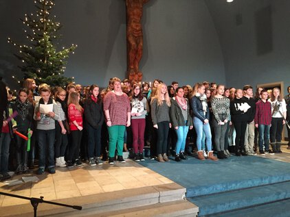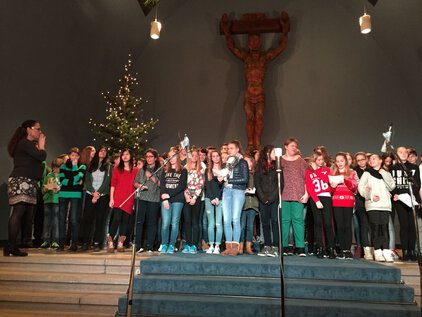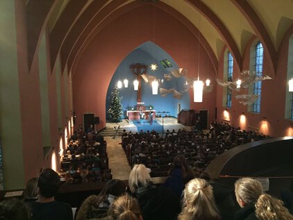 Einer langen Tradition zufolge trafen sich die meisten Schüler und Lehrer am letzten Schultag vor den Ferien zum Jahreswechsel zum Weihnachtssingen. Zum dritten Mal in der Luthergemeinde. In diesem Jahr stand die Veranstaltung, organisiert von der Fachschaft Ethik/Religion, unter dem Motto "Weihnachten International" und wurde von Bruce aus der 5. Klasse eröffnet. Es folgte eine informative und musikalische Reise um die Welt. Abschließend sangen alle gemeinsam "Adelte fideles".