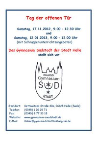 Das Gymnasium Südstadt öffnet für interessierte Eltern und (künftige) Schüler am 17.11.2012 von 9:00 - 12:30 Uhr seine Türen.